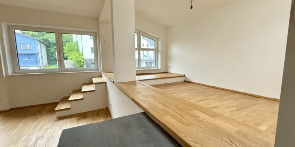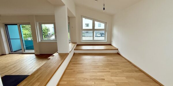 Die Wohneinheit teilt sich auf wie folgt: großzügiger Wohn- und Essbereich mit erhöhtem Lounge-Bereich, 2 Schlafzimmer, ein Badezimmer mit Badewanne und Fenster, WC separat, Abstellraum und Eingangsbereich.